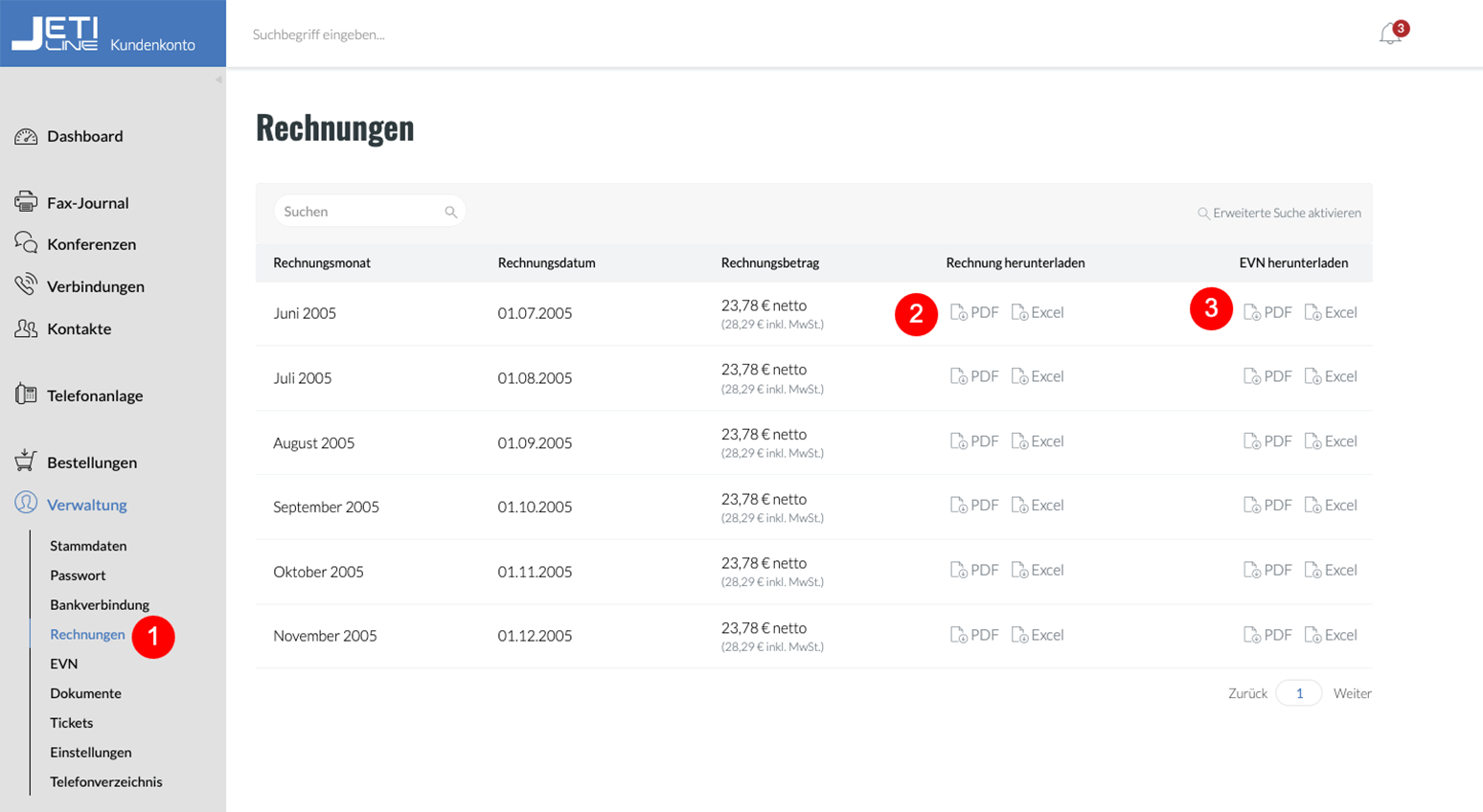 In Ihrem JETI Kundenkonto können Sie alle aktuellen und vergangenen Rechnungen einsehen und diese herunterladen. In der Übersicht in Ihrem Kundenkonto sehen Sie außerdem das Rechnungsdatum sowie die Höhe der Rechnung. Sämtliche Rechnungsdokumente können Sie im PDF-Format herunterladen und lokal abspeichern.